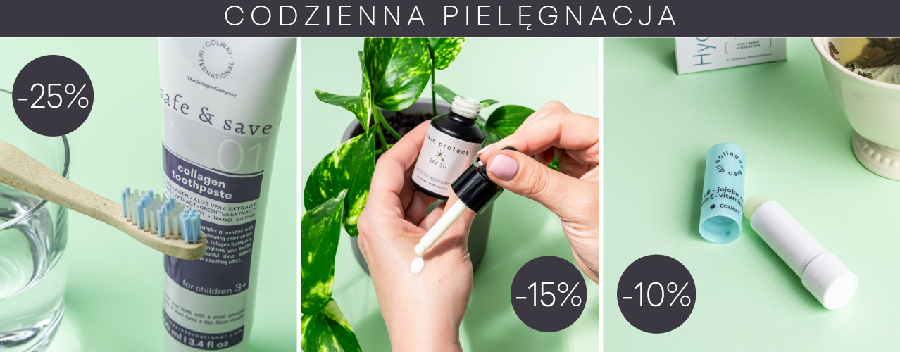 Codzienna pielęgnacja jest jak poranna kawa dla Twojej skóry. Tu niezawodnym sprzymierzeńcem będzie z pewnością Pasta do zębów z kolagenem, która zadba o zęby i dziąsła. Po umyciu twarzy nie zapomnij o aplikacji Skin protect SPF50, który broni przed szkodliwym promieniowaniem UVA i UVB Całości dopełni Kolagenowa pielęgnacja ust – dzięki której woja usta będą miękkie i nawilżone.